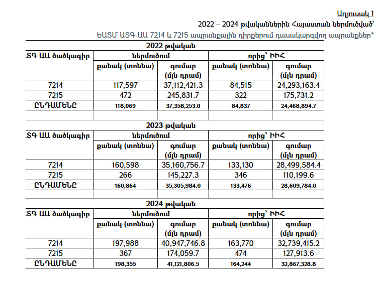 Ըստ վիճակագրական տվյալների՝ ԻԻՀ-ից պողպատե ամրանների ներկրումը Հայաստանի Հանրապետություն՝ շարունակաբար աճում է։